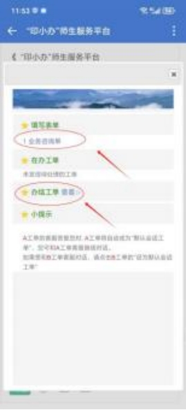 在咨询表单页,点击办结工单的“查看”,可查看历史工单。 也可以点“人工服务”转人工服务界面: