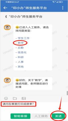 先选择相应服务类别(下图以“教学”为例),再在对话框内输入要咨询的问题,点发送,后台会有相应服务人员尽快回复您的问题: