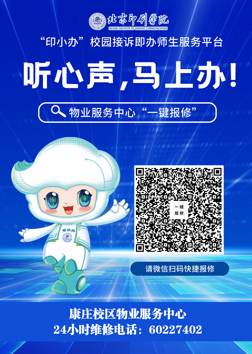 在北京印刷学院三个校区内学习、生活的师生,发现任何需要维修事项时,均可微信扫码实现“一键报修”,物业服务中心24小时将为全校师生提供维修服务。