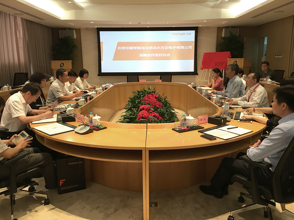 6月15日,北京印刷学院与北京北大方正电子有限公司战略合作协议签署仪式在方正集团举行。北京印刷学院党委书记高锦宏、校长罗学科,北京北大方正电子有限公司董事长邵行、副总裁刘长明出席了签约仪式。北京北大方正电子有限公司数字出版与教育事业部、媒体大数据事业部、通用产品事业部负责人,北京印刷学院新闻出版学院、科研处、教务处负责人以及相关教师和学生参加了签约仪式。