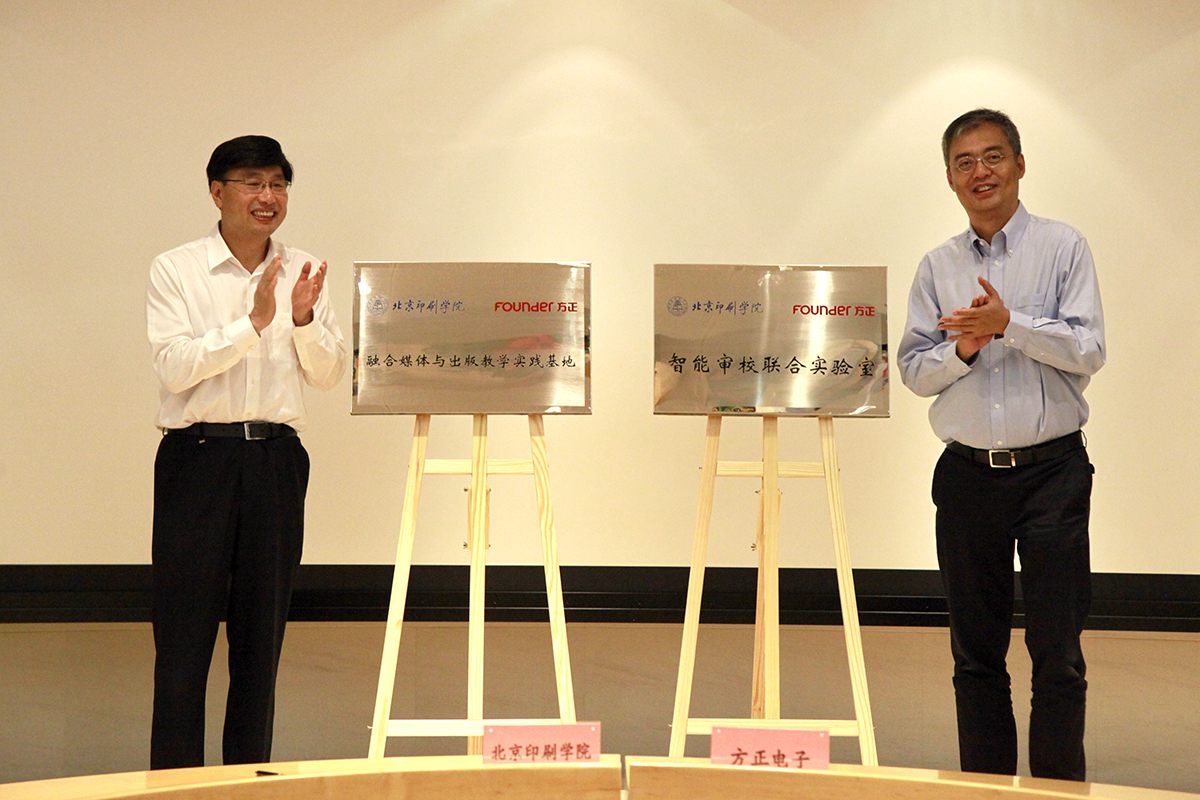 罗学科与邵行代表双方签署了协议,同时为双方联合成立的“北京印刷学院-方正电子智能审校联合实验室”、“北京印刷学院-方正电子融合媒体与出版教学实践基地”进行了揭牌。